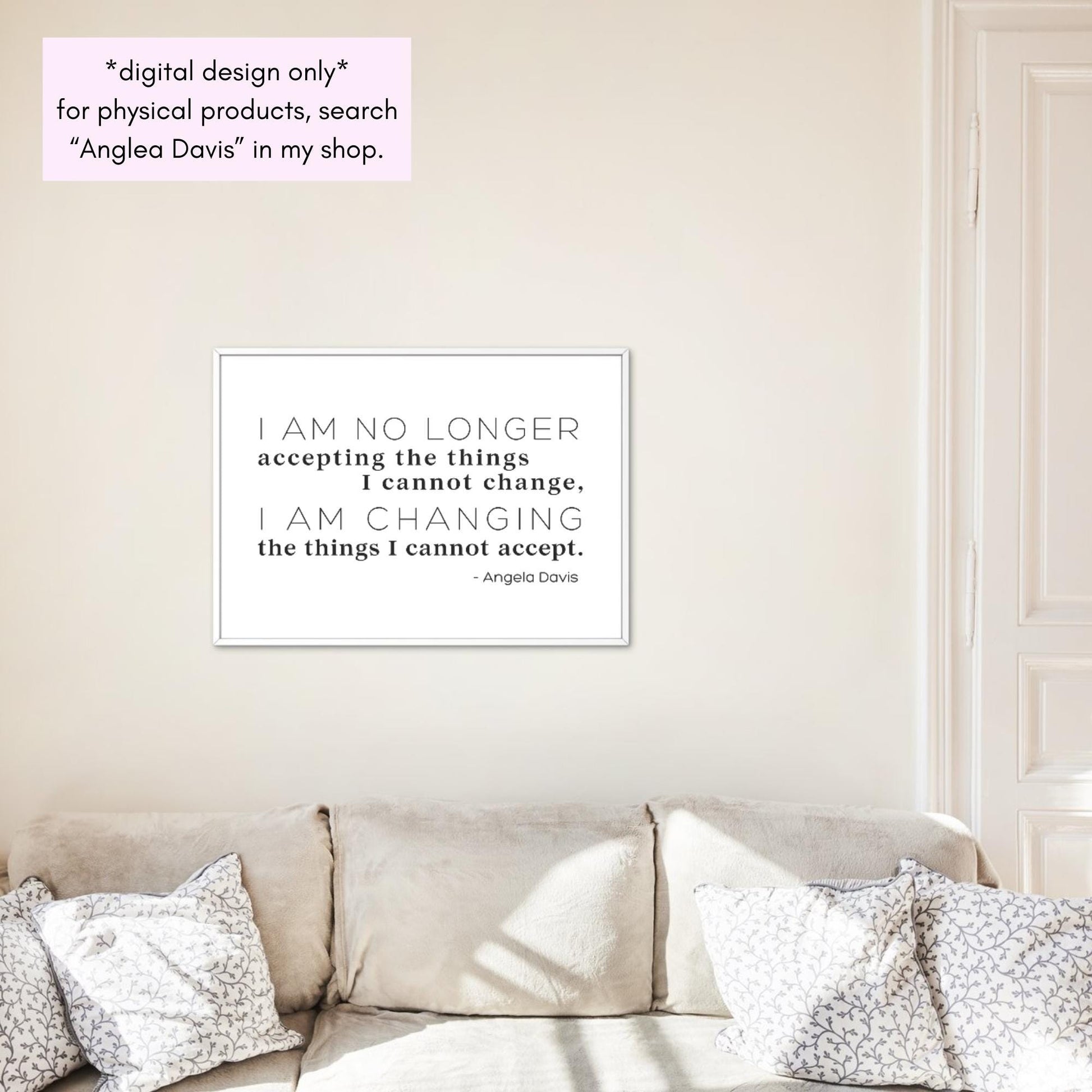 Transform your space with this powerful quote from activist and scholar Angela Davis: "I am no longer accepting the things I cannot change, I am changing the things I cannot accept."