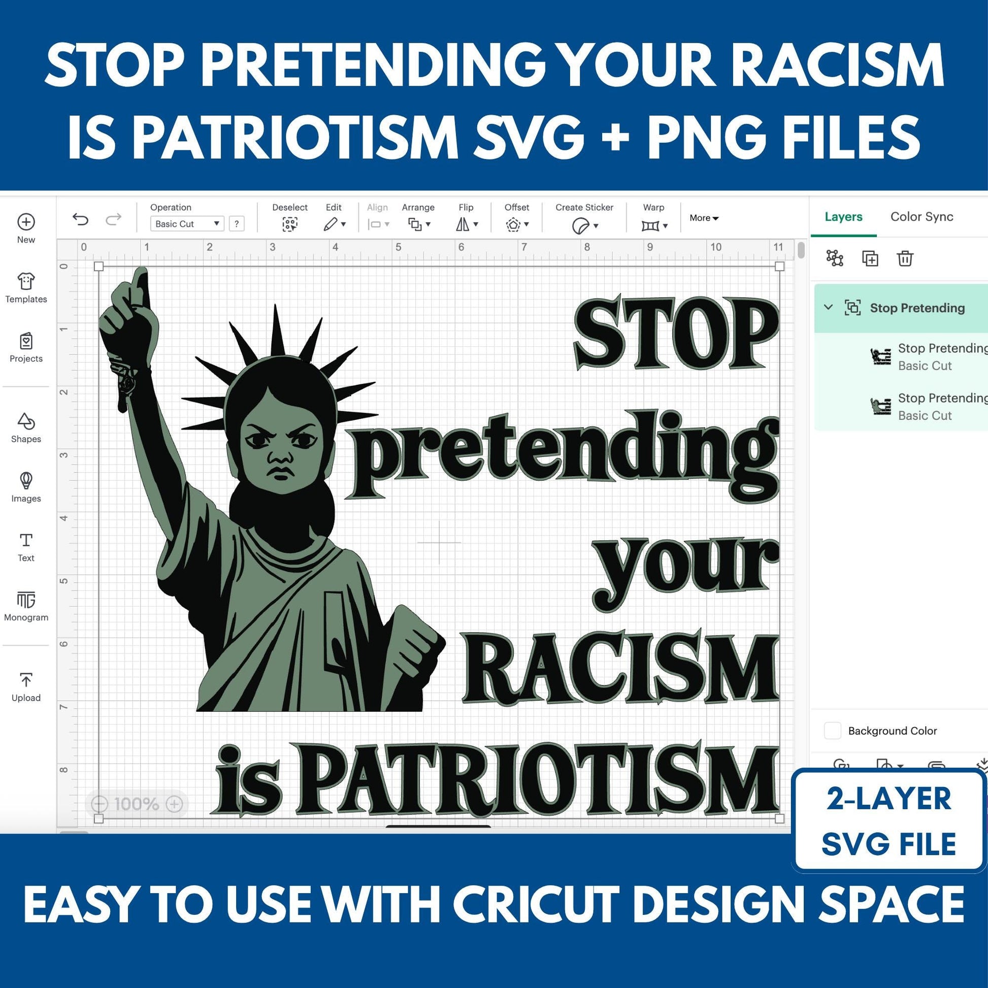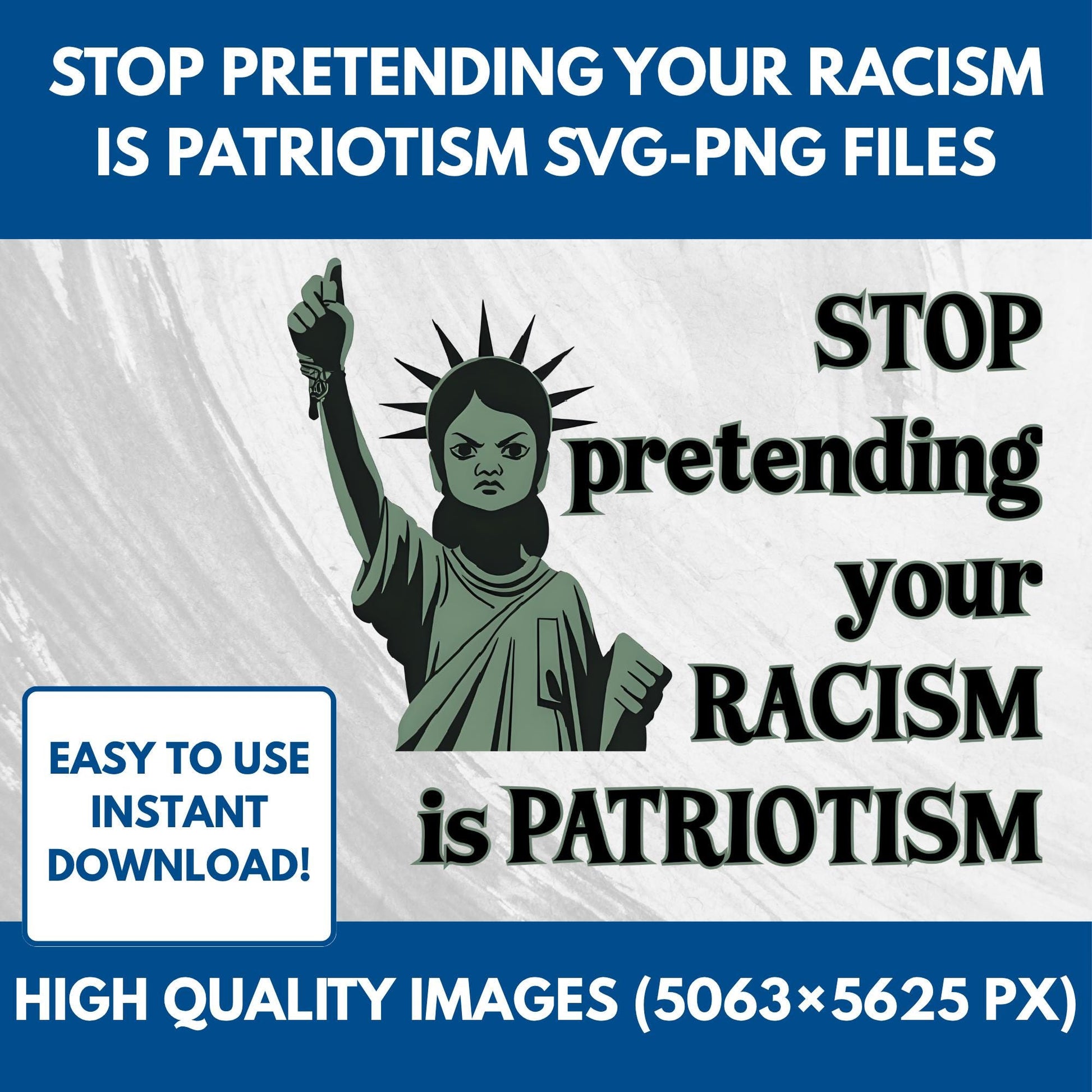 Utilize these "Stop Pretending Your Racism Is Patriotism" SVG and PNG files on your Cricut or Silhouette as cut files, or on documents, websites, or more as image files. The images are high quality, with 5063 × 5625 pixels each. The SVG is easily scalable and comes in two layers that stack seamlessly for easy use in crafting. The Statue of Liberty is holding a BLM fist and has an angry face to show that she is part of the resistance. With this digital download, you can be, too.