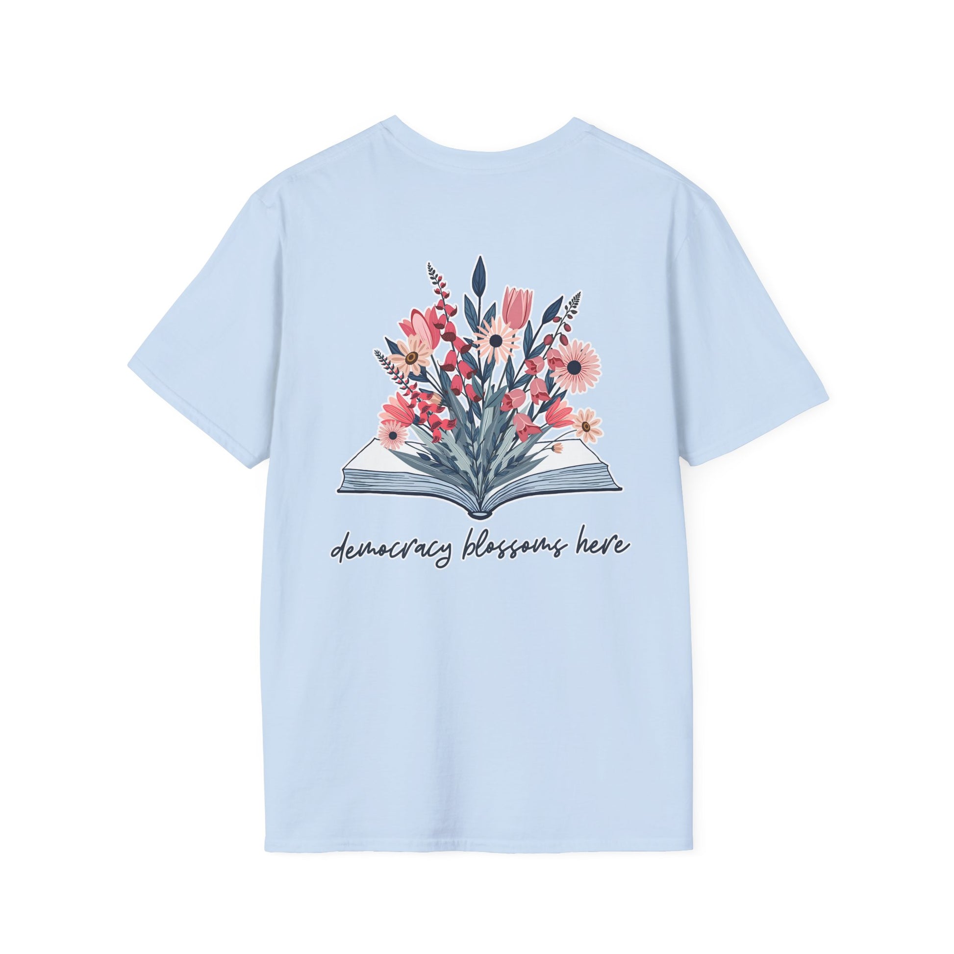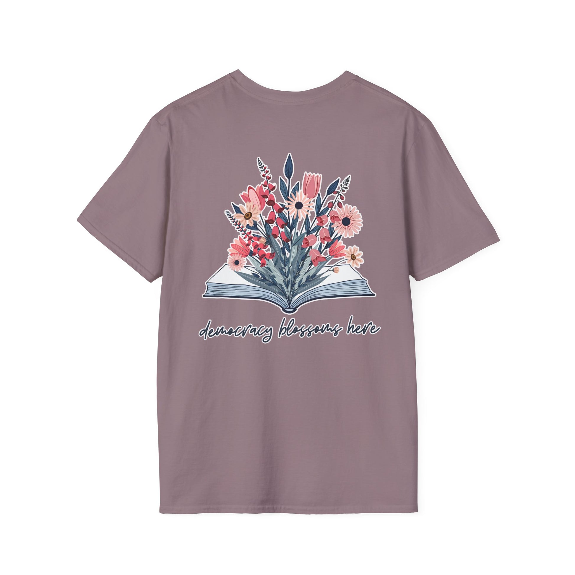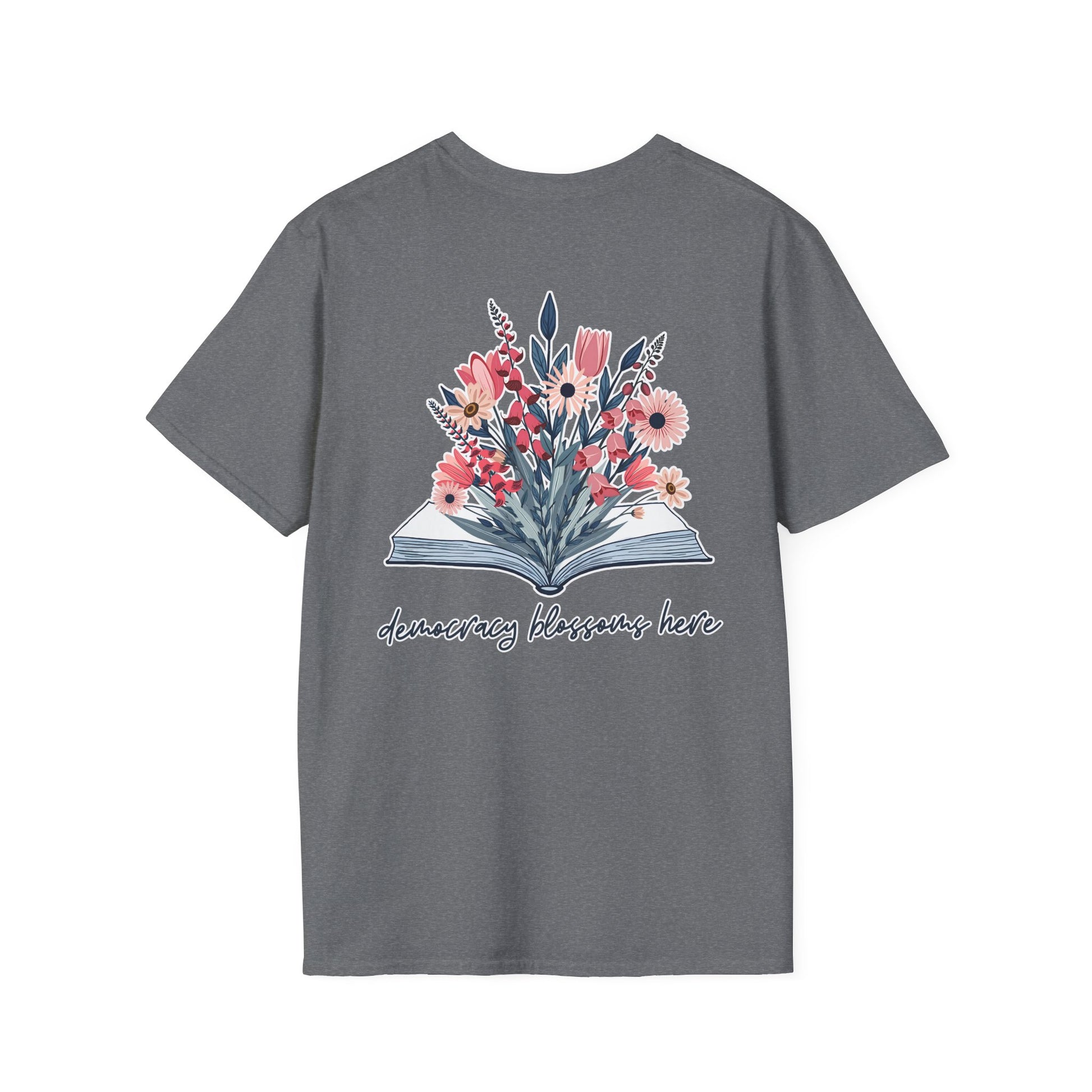 Floral Book Bouquet Unisex T-Shirt | Democracy Blossoms Here - Foxglove Daisy Tulip