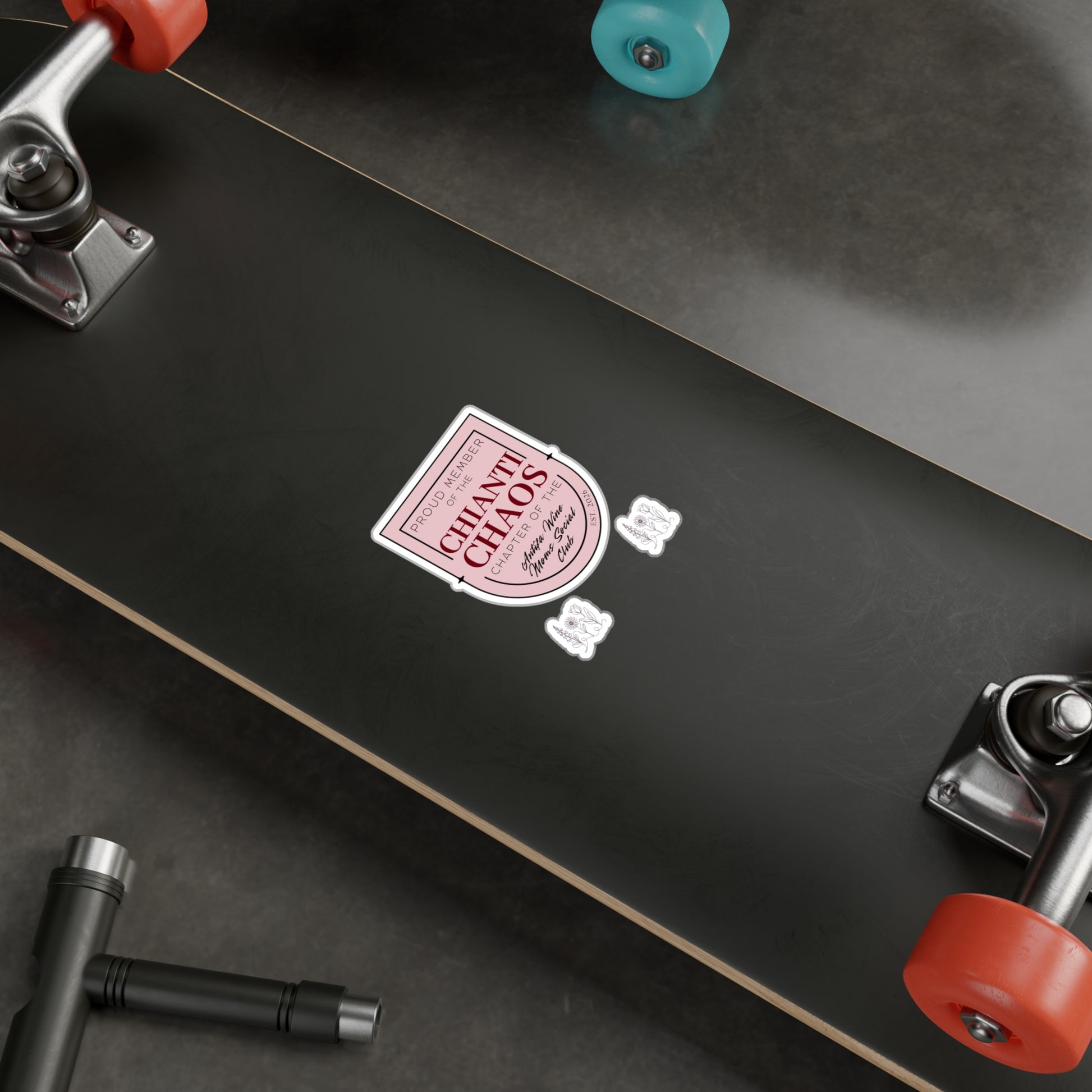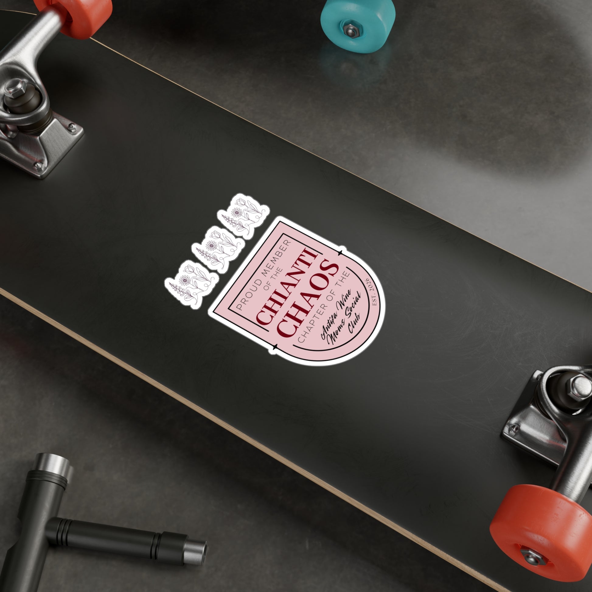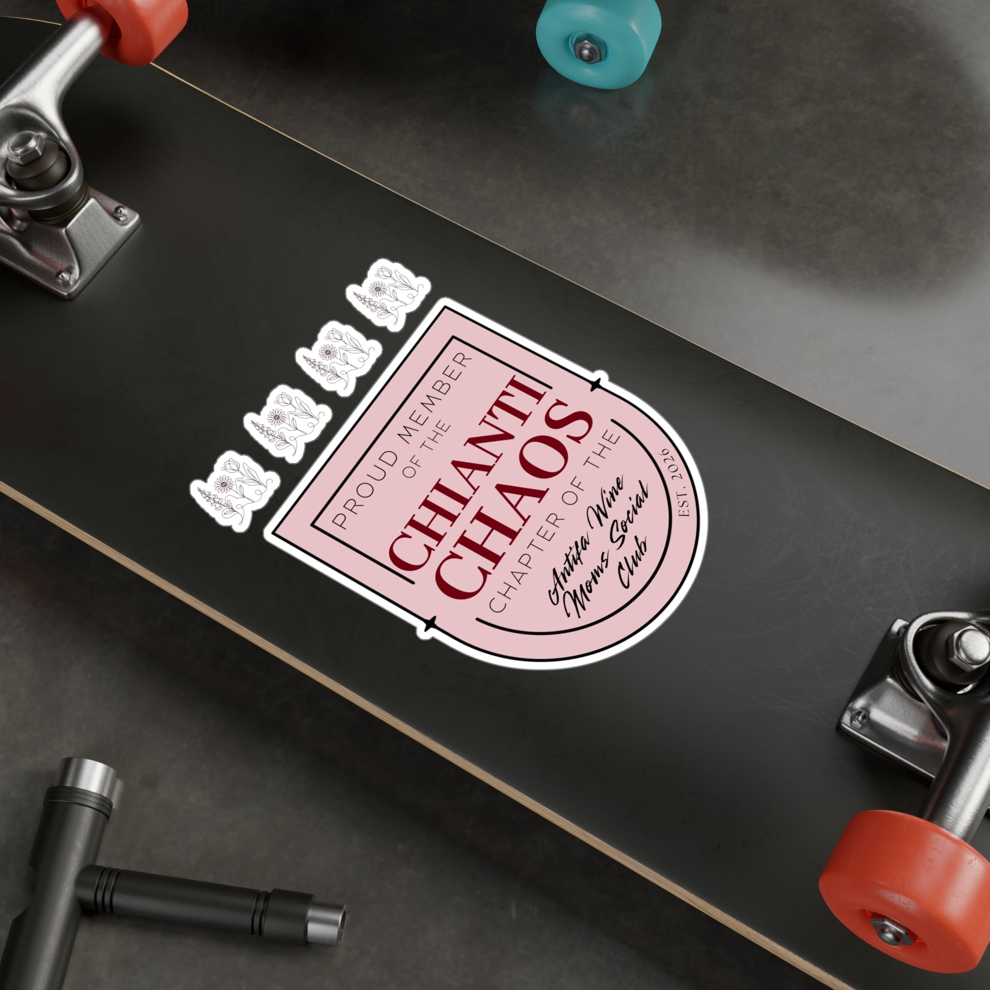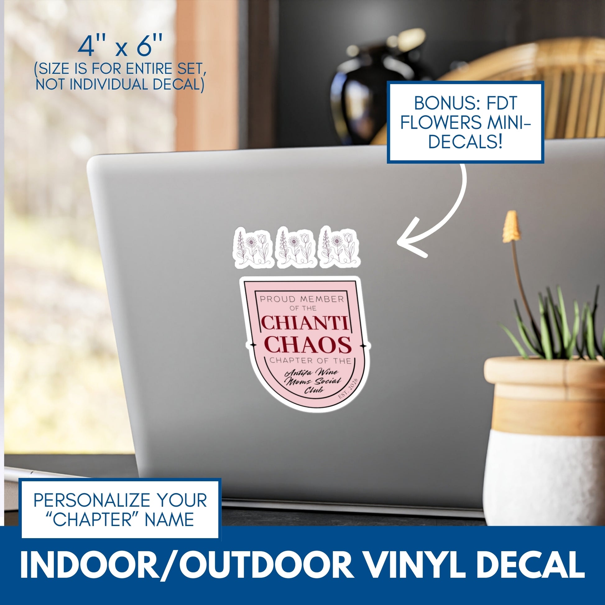 A set of satin-finish kiss-cut vinyl decals that bring warm, playful personality to water bottles, laptops, car bumpers, and windows. The main badge-style sticker reads “Chianti Chaos” (or whatever "Chapter" of the Organized Wine Mom Gang you want!) in rich burgundy on a soft pink shield. The satin surface keeps colors subtle and elegant while resisting scuffs, sunfade, and water for up to three years outdoors. These decals peel away cleanly when you want to switch things up, and the thin white kiss-cut border gives each piece a neat, finished look. They arrive on backing paper ready to apply.