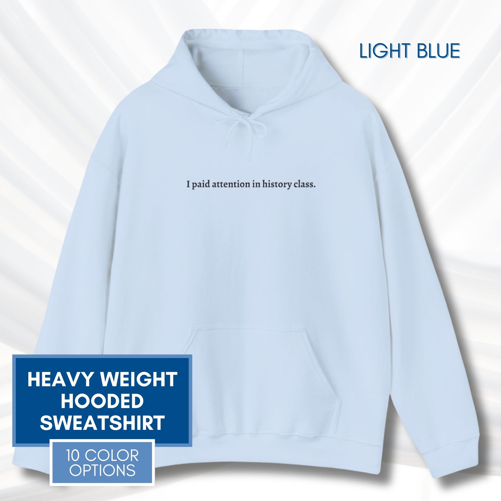 This soft, heavy-weight hooded sweatshirt settles into your day without shouting, with beautifully embroidered text reading, "I paid attention in history class." The roomy kangaroo pocket and double-lined hood feel familiar and comforting, while the color-matched drawcord and classic fit keep the silhouette simple and wearable. It layers easily over tees or under coats, moving from study sessions and late-night coffee runs to slow weekend walks.