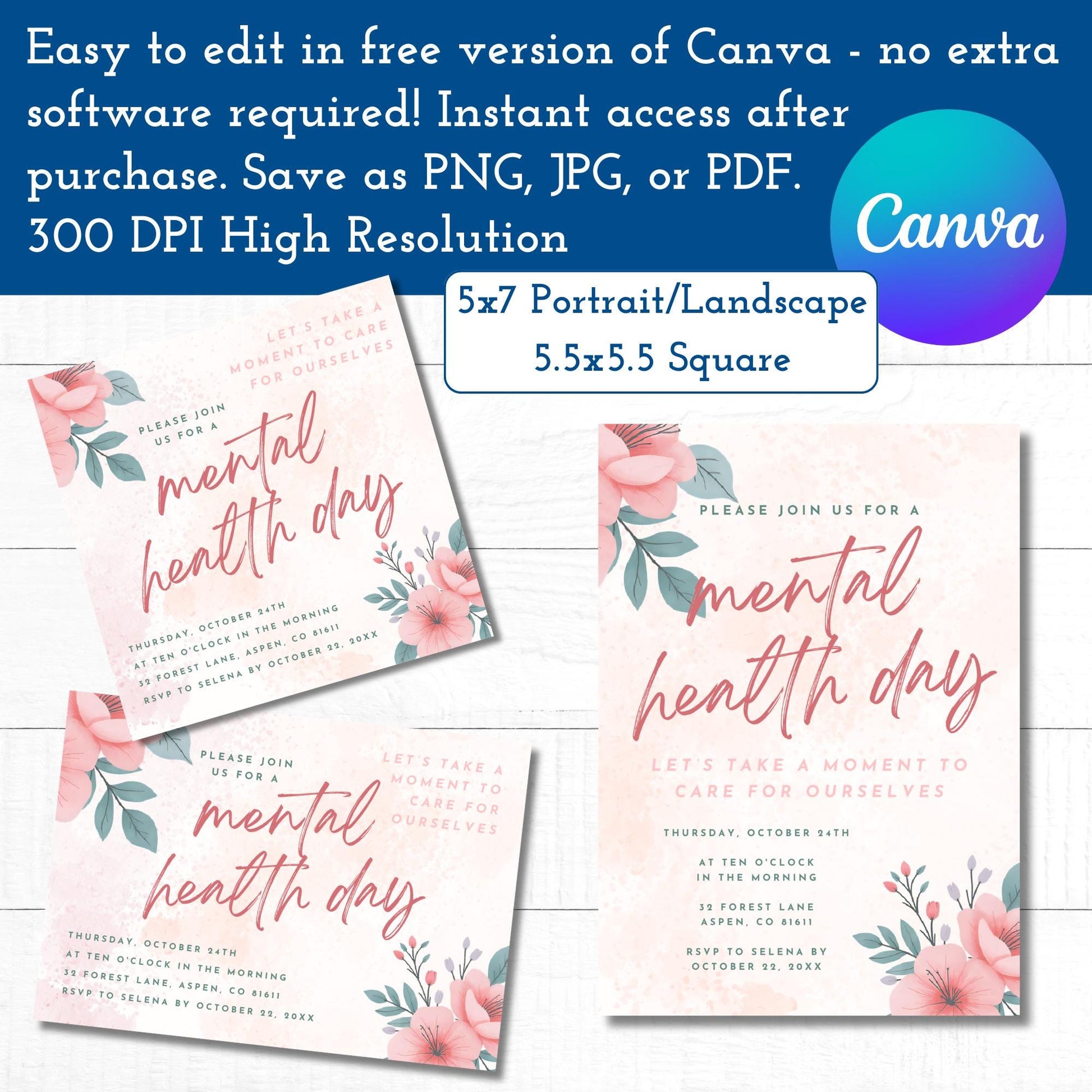Self-Care Deluxe Party Kit | Printable Mental Health Day Invites + Decor + Activities (Canva Templates, PDFs)