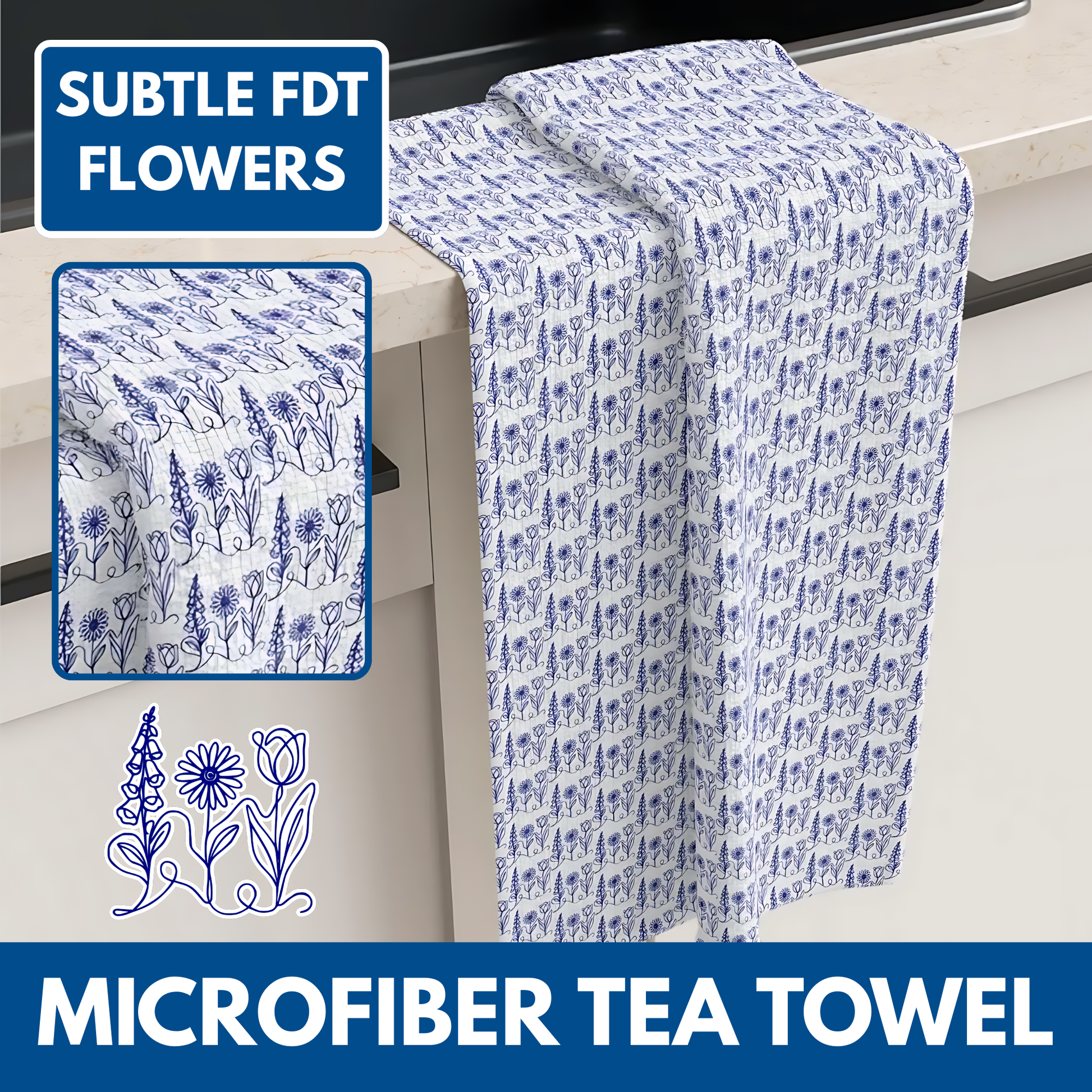 Subtle FDT Flowers Microfiber Tea Towel | Blue & White Floral, Foxglove Daisy Tulip Kitchen Towel